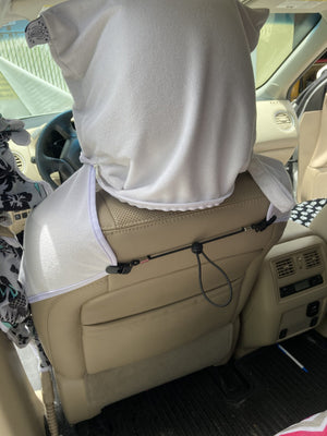 The velvety polyester towel is bonded to a waterproof layer and comes in a handy compact carrying bag. Just unzip it, slide over your headrest and use the provided clip to hold the towel in place on your auto seat. Don't worry, it's machine washable.