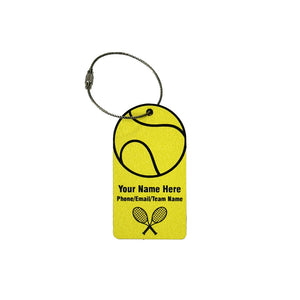 Add some personality to your tennis gear bag with this custom tennis ball name tag! Your personalized tag comes with a strong stainless steel loop to make it easy to spot your bag with your name and contact details. Elevate your tennis game with a touch of style and practicality! Have a cool logo for your team or club? If it's a simple design and you have a high quality black & white graphic file (.jpg, .pdf, .png), we may be able to use it on the tag instead of the crossed racquet graphic. Contact us for details..