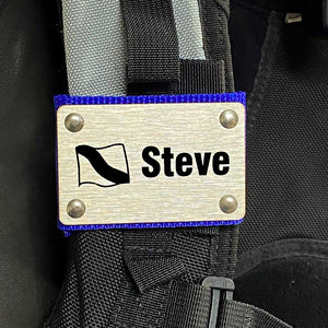 This is a special edition of our very popular BC name tag. It is made from the same polypropylene webbing as our standard scuba BC tag but instead of the embroidered name, there is a marine grade stainless steel name plate that is laser marked with your name and optional graphics. The stainless steel plate is attached to the webbing with stainless steel rivets.