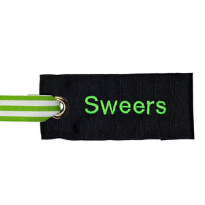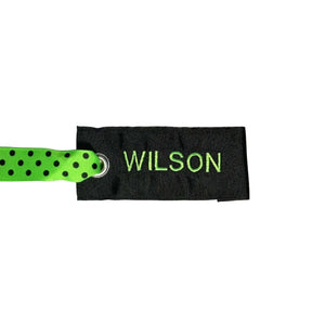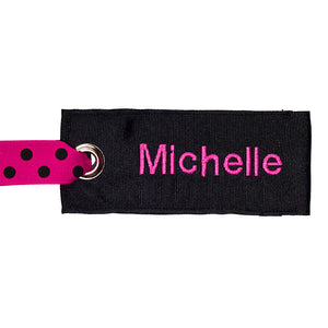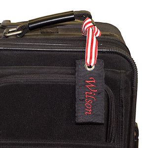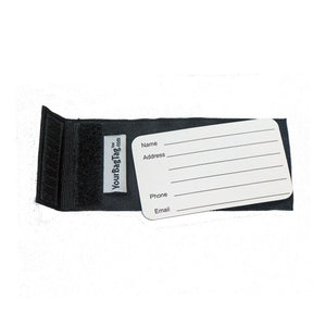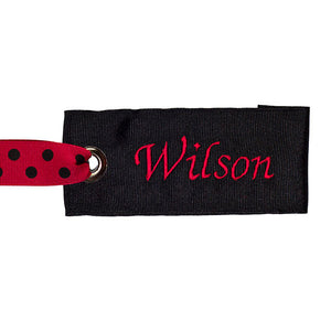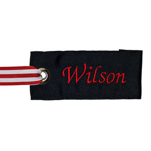 Sleek and stylish, our personalized black fabric luggage tag is the perfect accessory to any piece of luggage. With your choice of colored ribbon and lettering, the YourBagTag custom black tag makes it easy to pick your bag out of a crowd.