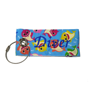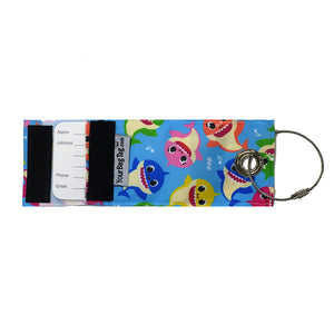 This bright blue fabric luggage tag is imprinted with playful shark characters in multiple colors - designed to make you smile. It even has the 🎵 doo 🎵 doo. This is a limited edition - we only found 1 roll of the fabric so there are only 125 tags available. When they are gone, that is it.