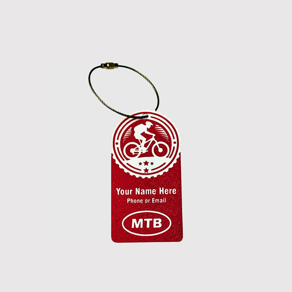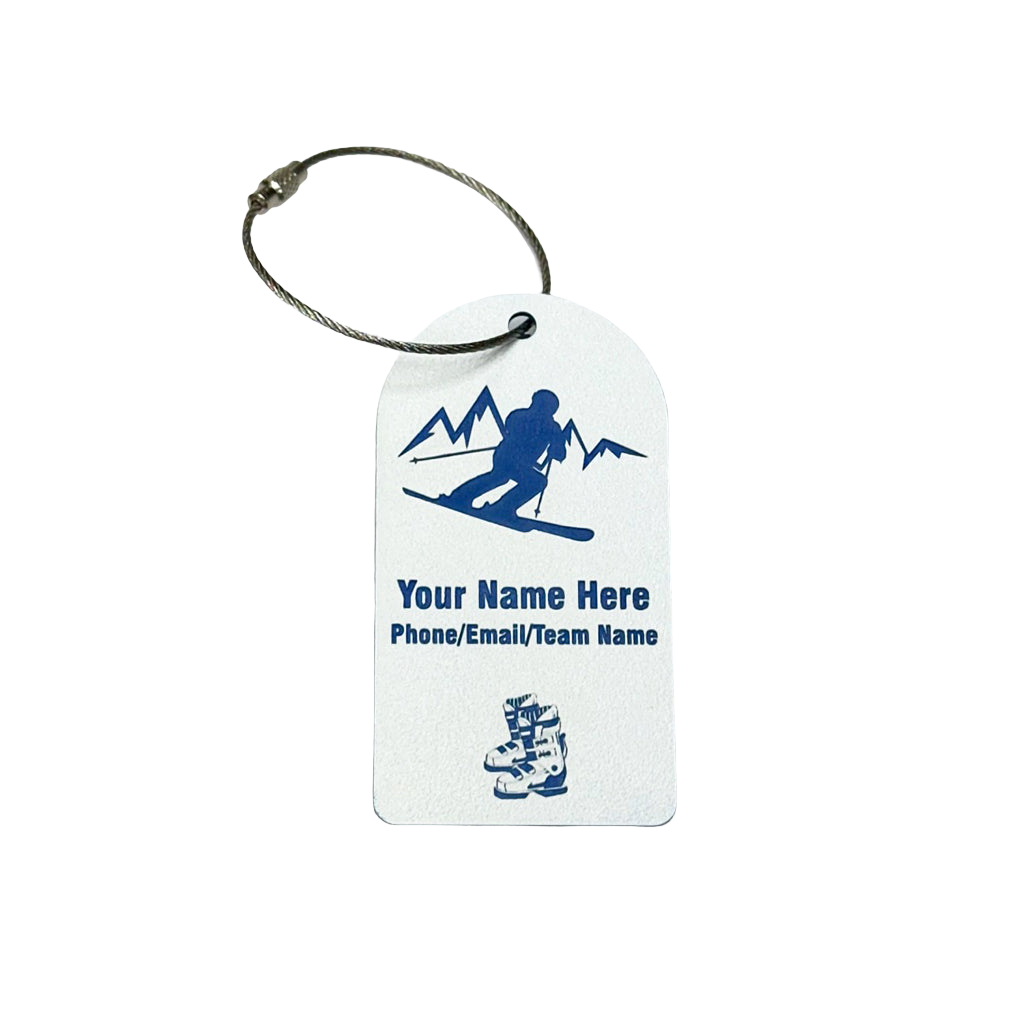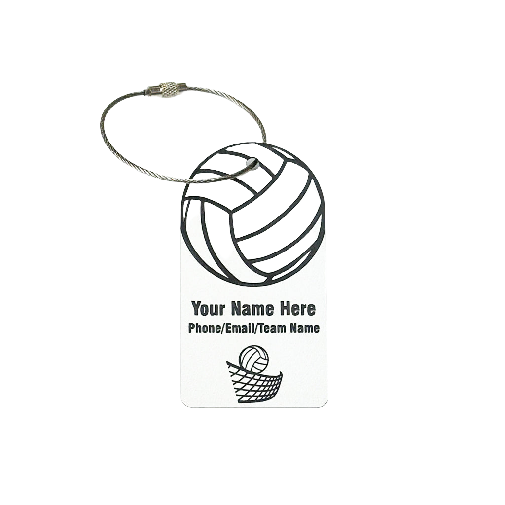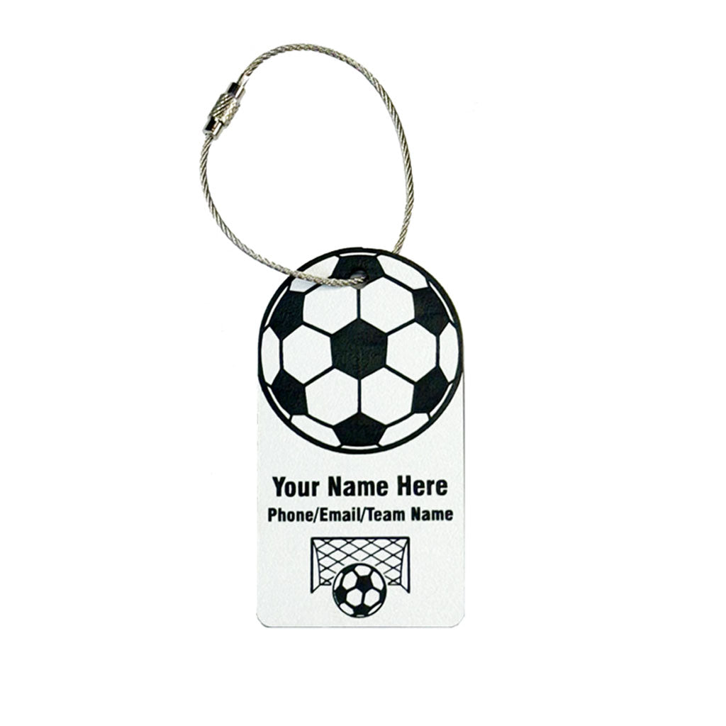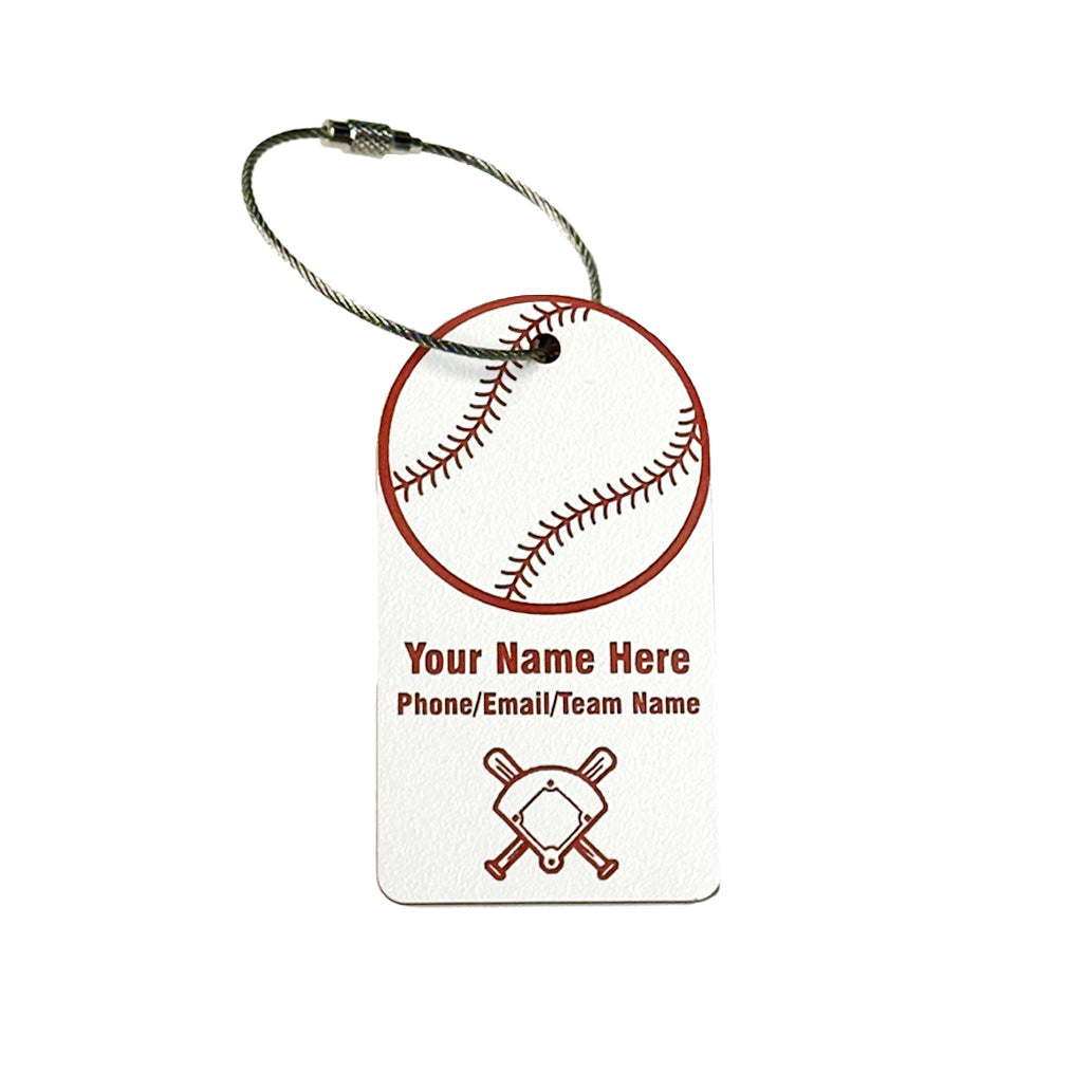 Personalized name and identification tags for sports gear bags. These tags can be customized with team names and logos, depending on the type and style of graphics.