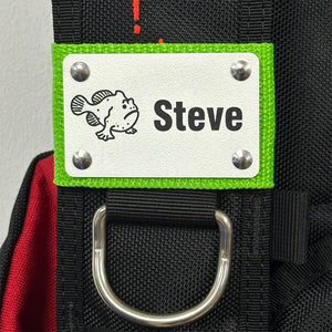 Made from the same sturdy polypropylene webbing as our standard scuba BC tag, this unique version includes a plastic name plate with your name and optional graphics, securely attached with aircraft-grade stainless steel rivets. The base tag strap comes in a range of popular colors - see the photo below.